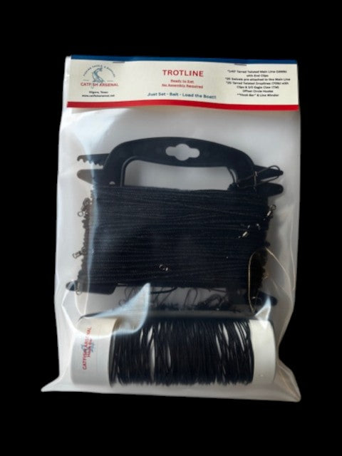 Our Trotlines are handmade and inspected using top-of-the-line components. Ready To Set, NO ASSEMBLY required. It comes on a Line Winder and a "Catfish Arsenal" "Hook Bar" to keep your Droplines Organized and Secure.